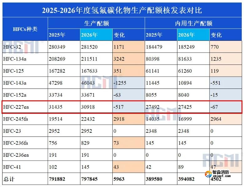 相較于2025年生產配額31435噸,2026年七氟丙烷(HFC-227ea)生產配額減少了517噸;內用生產配額較2025年減少67噸,具體如下: